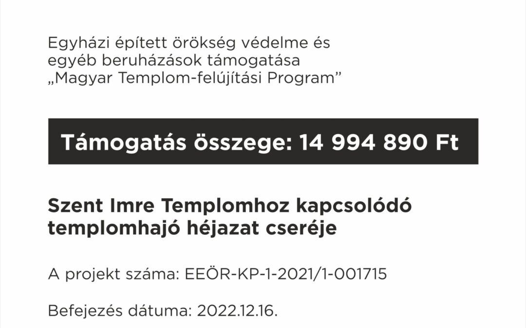 A munkálatok 2022 év végén már befejeződtek. Az elkészült és megújult tetőhéjazat átadására és a projekt hivatalos befejezésére 2022.01.29-én 9:30-kor kezdődött ünnepélyes szentmise keretében került sor. A bejáratban elhelyezett projekttábla szerint a Bethlen Gábor alapkezelő Zrt.által lebonyolított; „Egyházi épített örökség védelme és egyéb beruházások támogatása – Magyar Templom-felújítási Program”-on keresztül Magyarország Kormánya közel 15 millió forinttal támogatta a Szent Imre templomhoz kapcsolódó templomhajó héjazatának cseréjét.